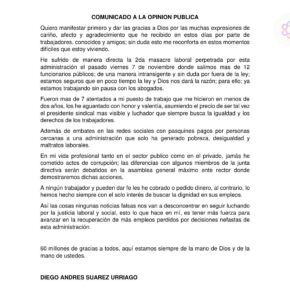 “Nos sacaron a 12 o 13 personas de nuestros cargos el viernes, sin que el fallo esté en firme. Además, varias de esas personas, entre ellas yo, tenemos fuero sindical vigente”, denunció Diego Suárez, uno de los funcionarios afectados, quien afirmó que su desvinculación se dio mediante el Decreto 0422 del 8 de noviembre de 2025.