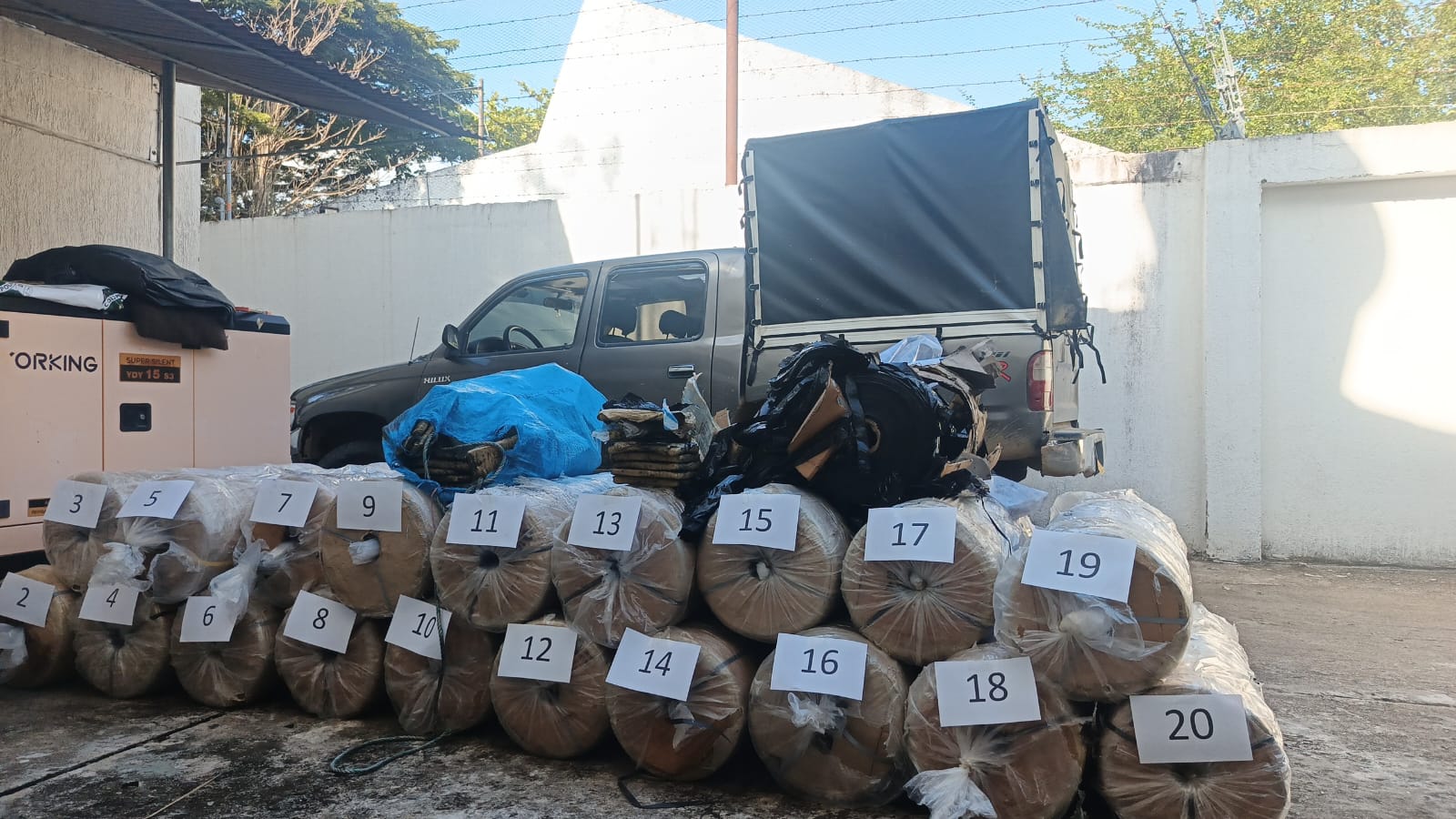 Durante la verificación, las autoridades hallaron 20 rollos de plástico de aproximadamente 1,50 metros de longitud, que a simple vista parecían material industrial. Sin embargo, al realizar una inspección más detallada, se descubrió que en su interior ocultaban 910 kilogramos de marihuana.