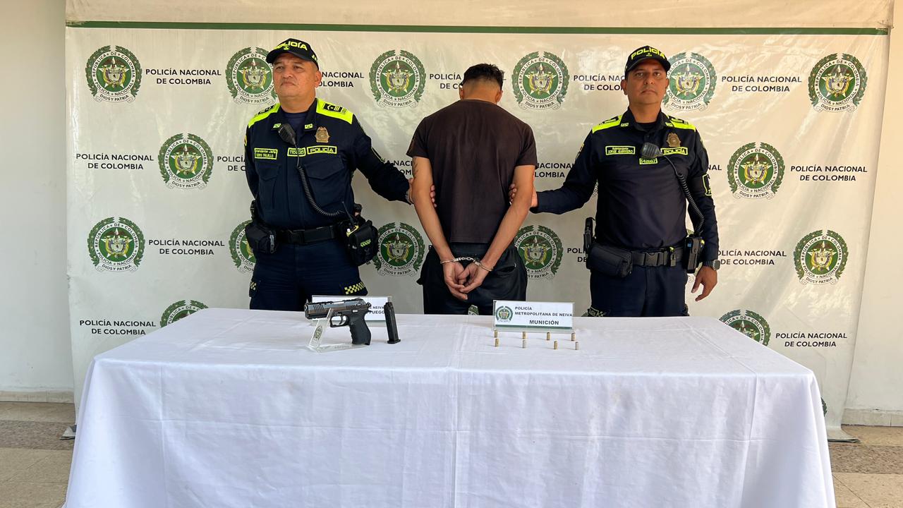 La Policía Nacional de Colombia en Neiva logró la captura en flagrancia de un hombre de 25 años por el delito de fabricación, tráfico, porte o tenencia de armas de fuego, accesorios, partes o municiones, en medio de operativos de control y prevención desarrollados mediante la estrategia ARCO.