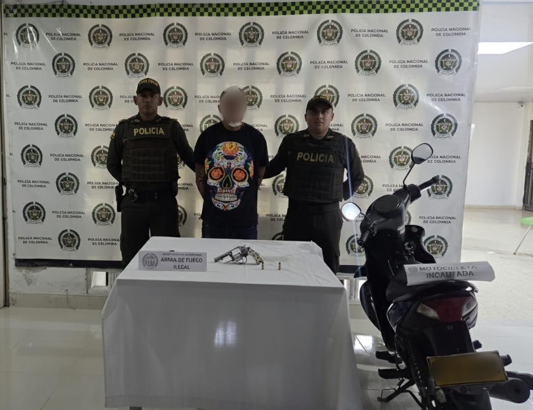 Durante el registro personal, los policías hallaron en su poder un revólver, el cual fue incautado como material probatorio. Según las autoridades, este individuo cuenta con 15 anotaciones en el Sistema Penal Oral Acusatorio (SPOA) por delitos como hurto calificado, lesiones personales, porte ilegal de armas de fuego y tráfico de estupefacientes, entre otros.