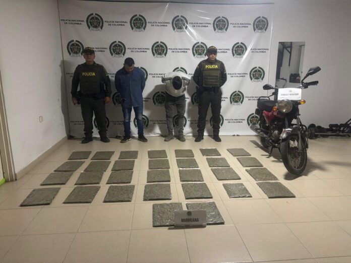 Dos hombres fueron cobijados con medida de aseguramiento en centro carcelario tras ser sorprendidos por la Policía Nacional transportando 15 kilogramos de marihuana en motocicleta sobre el puente Los Ángeles, en la vía que comunica a Paicol con Tesalia.