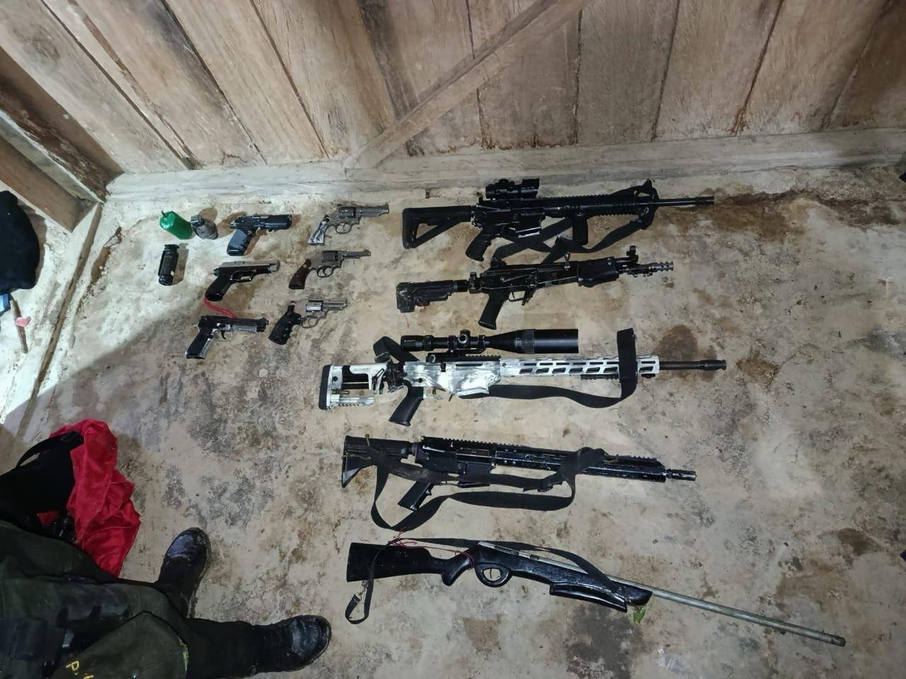 Durante la intervención fueron incautados tres fusiles de asalto, un fusil de alta precisión, seis armas cortas, minas, granadas, munición, proveedores, un dron, radios de comunicación, chalecos antibalas, binoculares y una escopeta, material con el que pretendían fortalecer su capacidad ofensiva.