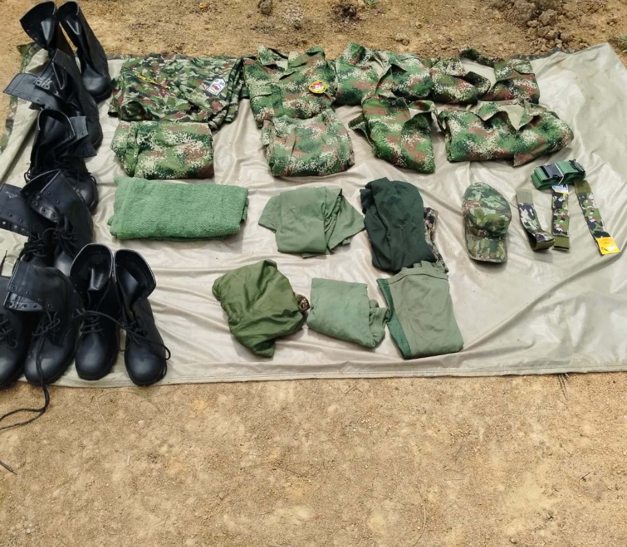 En el lugar, los uniformados encontraron una caneca plástica enterrada que funcionaba como depósito clandestino. Tras la verificación por parte del grupo de Explosivos y Demoliciones (EXDE), se estableció que en su interior había elementos de intendencia, entre ellos botas, chalecos y uniformes de uso privativo de las Fuerzas Militares.