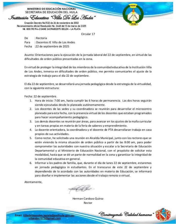 La decisión se tomó tras evaluar los recientes hechos violentos que han afectado la tranquilidad de la población, generando temor en las familias del sector. Según manifestaron los directivos, la prioridad es proteger la vida de la comunidad escolar sin detener el calendario académico, por lo que se implementaron mecanismos digitales para garantizar la continuidad en los procesos de enseñanza y aprendizaje.