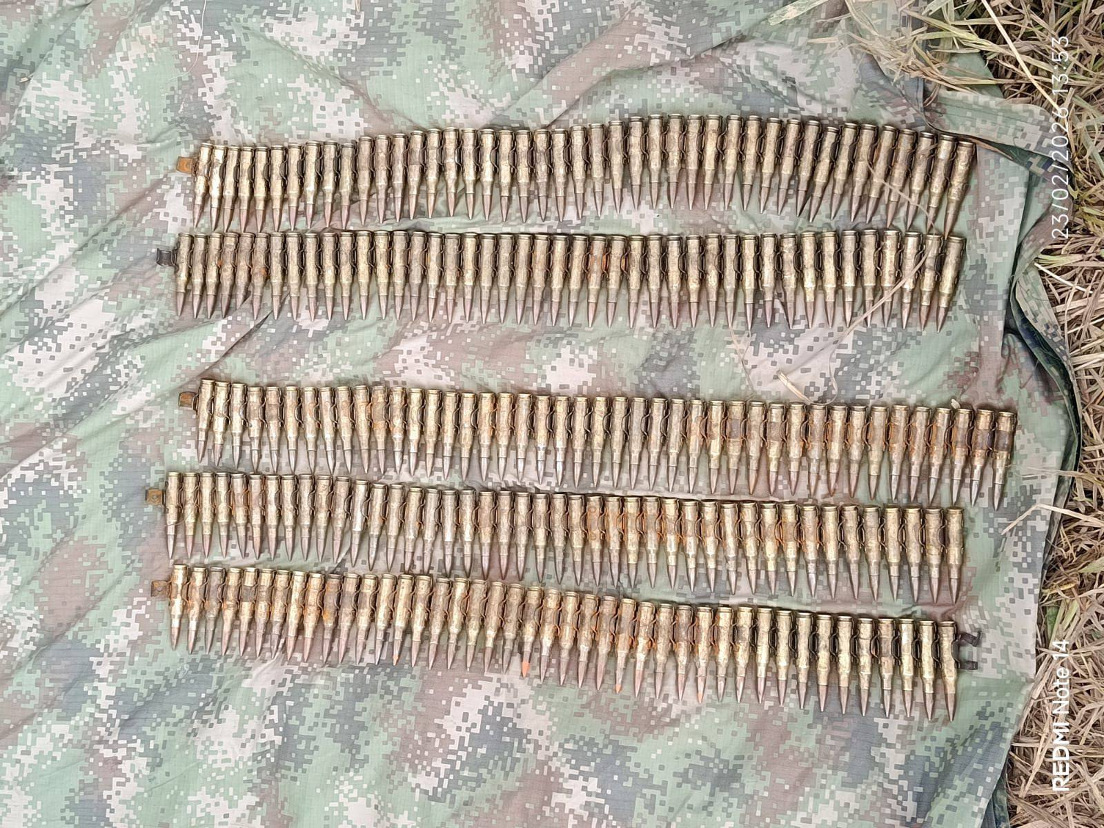 En el lugar fueron encontradas 215 unidades de munición eslabonada calibre 7.62 milímetros para ametralladora, tres unidades de munición calibre 7.62 milímetros para fusil tipo AK y tres unidades de munición calibre 5.56 milímetros. Según el Ejército, este tipo de material representa un riesgo para la seguridad de la población civil y de la fuerza pública.