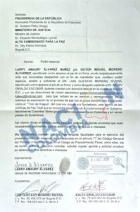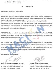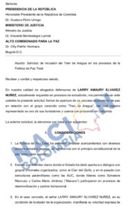 La petición fue presentada mediante un poder especial otorgado por Larry Amaury Álvarez Núñez, presunto fundador de la estructura, quien delegó su representación legal en el abogado Luis Gustavo Moreno Rivera, exfiscal anticorrupción, y el abogado suplente Kalev Giraldo Escobar. El documento, con fecha del 1 de octubre de 2025, está dirigido a la Presidencia de la República, el Ministerio de Justicia y la Oficina del Alto Comisionado para la Paz.