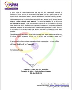 La concejala Lourdes Mateus, quien obtuvo la mayor votación en la consulta interna del Pacto Histórico, presentó oficialmente su carta de renuncia al Concejo de Neiva con el fin de concentrarse de lleno en su campaña a la Cámara de Representantes.