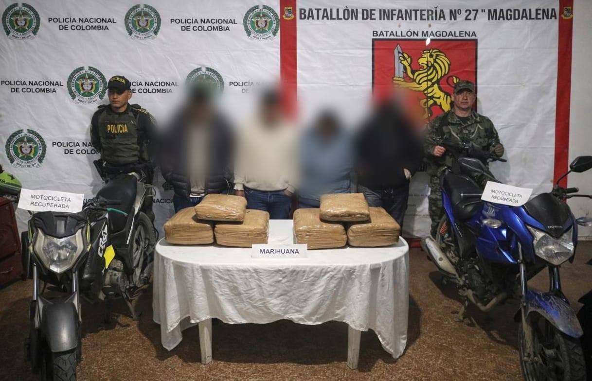 En este mismo sector del sur del departamento, mediante un segundo dispositivo de control, fueron capturados dos hombres y dos mujeres que se desplazaban en motocicletas. Durante la inspección, al interior de bolsos que portaban los implicados, se encontraron seis paquetes de marihuana con un peso aproximado de 25 kilogramos, generando una afectación adicional de $37.500.000 a las finanzas ilícitas.