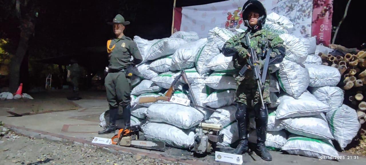 La Policía en coordinación con el Ejército Nacional, adelantó un importante operativo en zona rural de Villavieja que permitió el hallazgo de 174 bultos de carbón vegetal, una motosierra, una motobomba y dos armas de fuego tipo escopeta con su respectiva munición.