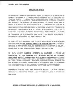 Una jornada de protesta anunciada por transportadores del norte de Villavieja podría generar afectaciones en la movilidad hacia el relleno sanitario Los Ángeles, en Neiva, durante este lunes 27 de abril de 2026.