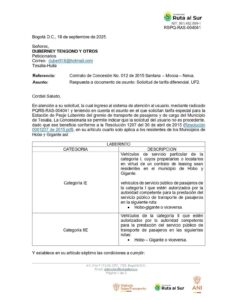 La empresa explicó que, según la Resolución 0001207 de 2015 del Ministerio de Transporte, este beneficio solo aplica a residentes de los municipios de Hobo y Gigante, así como a vehículos que operen en rutas específicas entre estas dos localidades. Por lo tanto, la petición elevada desde Tesalia no cumple con los requisitos normativos.