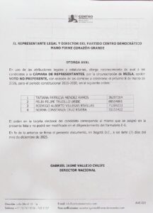 Con la reconfiguración, Tatiana Méndez ocupará el primer renglón, mientras que Felipe Trujillo pasará al segundo puesto. En el tercer lugar, identificado con el número 103, estará el empresario Rodrigo Alberto Villegas Rivillas, reconocido por su participación en iniciativas privadas y gremiales en el Huila. La lista la cierra la empresaria neivana Norma Constanza Cruz Rivera, quien será la cuarta aspirante.