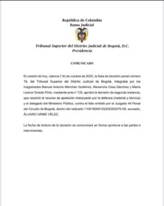 El Tribunal Superior de Bogotá anunció que ya resolvió el recurso de apelación presentado en el proceso judicial contra el expresidente Álvaro Uribe Vélez, quien fue condenado en primera instancia a 12 años de prisión domiciliaria por los delitos de soborno en actuación penal y fraude procesal.