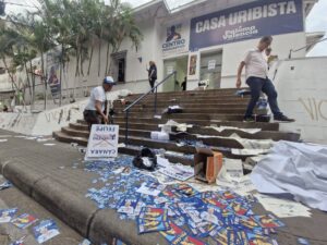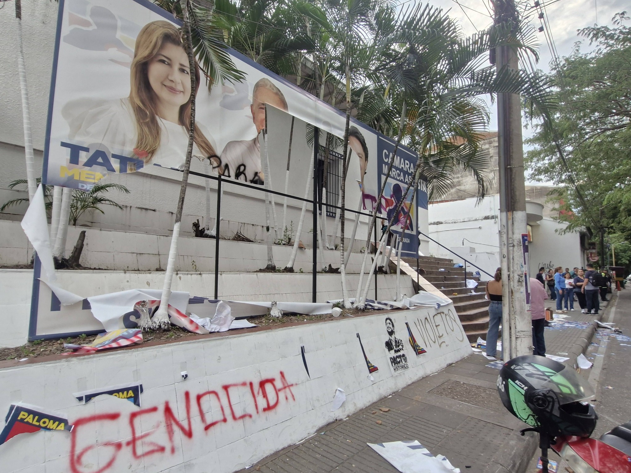 El candidato del Centro Democrático, Felipe Trujillo, aseguró que durante los disturbios un vigilante de la sede fue agredido por algunos manifestantes. Según indicó, el trabajador recibió golpes en medio de los desmanes. Hasta el momento, las autoridades no han entregado un balance oficial sobre personas lesionadas o capturadas.